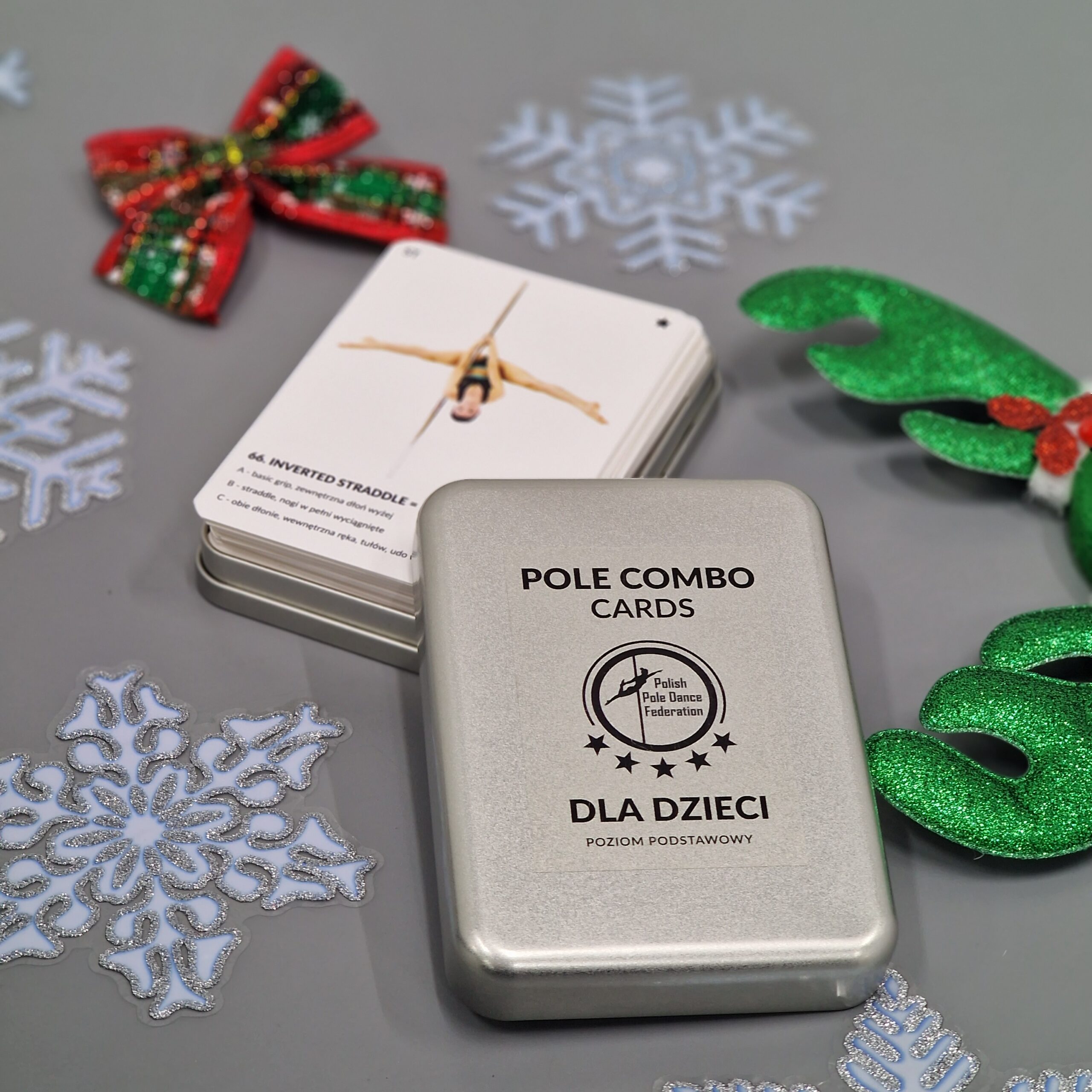 Pole Combo Cards dla dzieci to 85 kart A6 z figurami z poziomu podstawowego ponumerowanych według stopnia trudności. Na każdej karcie znajduje się nazwa figury w języku angielskim oraz jej opis (nazwa chwytu, pozycja rąk i nóg oraz punkty styku ciała z drążkiem pionowym). Opis figur oraz instrukcja są w języku polskim.
